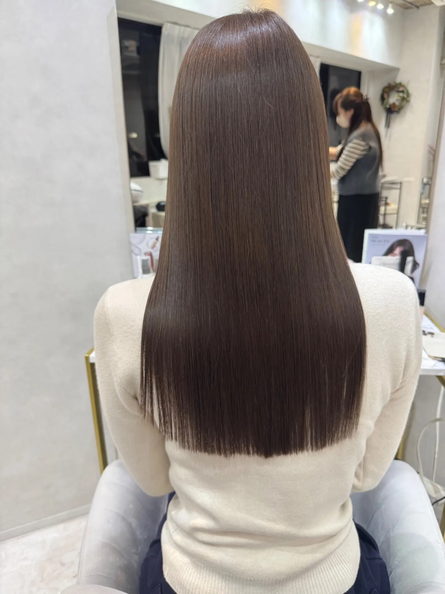 また、施術前後のケアも徹底。髪の水分バランスを整え、熱によるダメージを最小限に抑える独自のアイロン技術を用いています。これらの工夫が、柔らかくツヤのある髪を長期間キープする理由です。